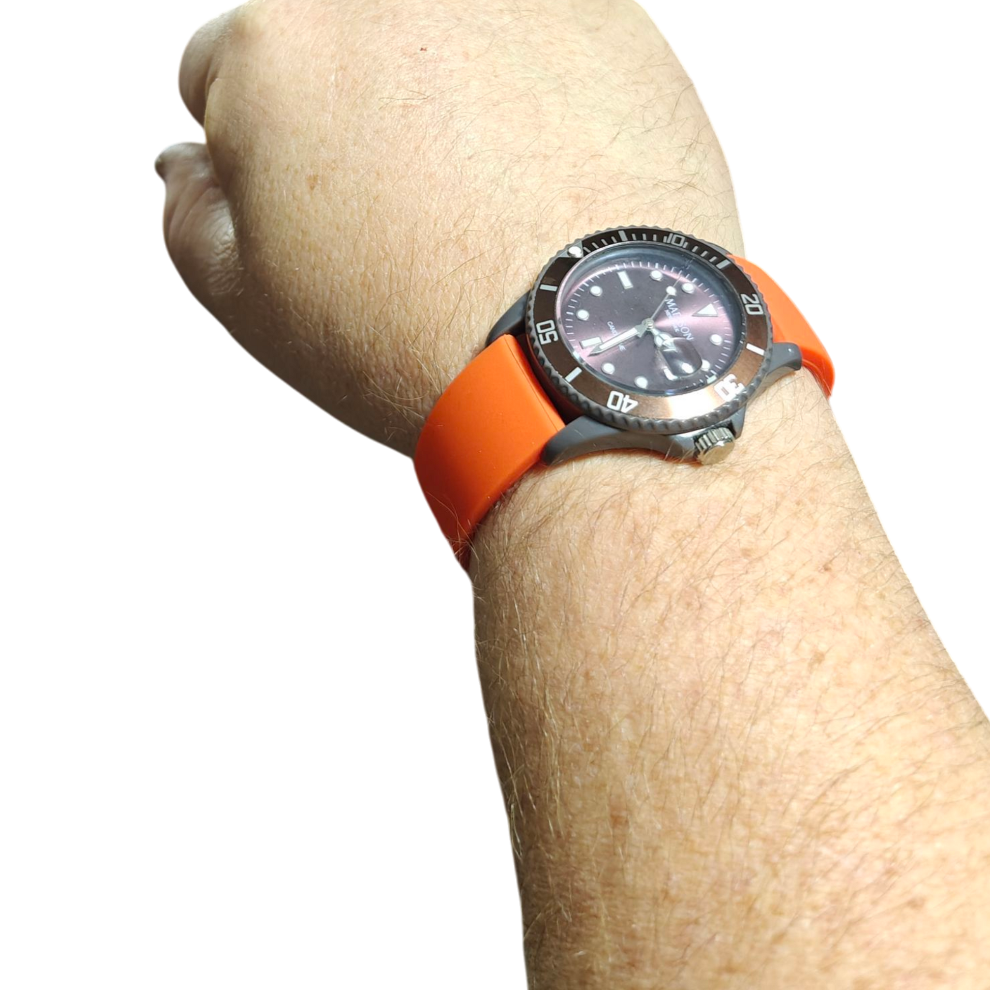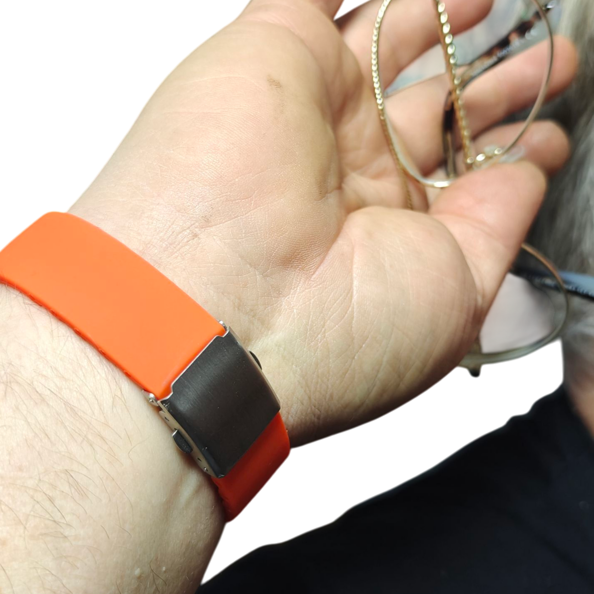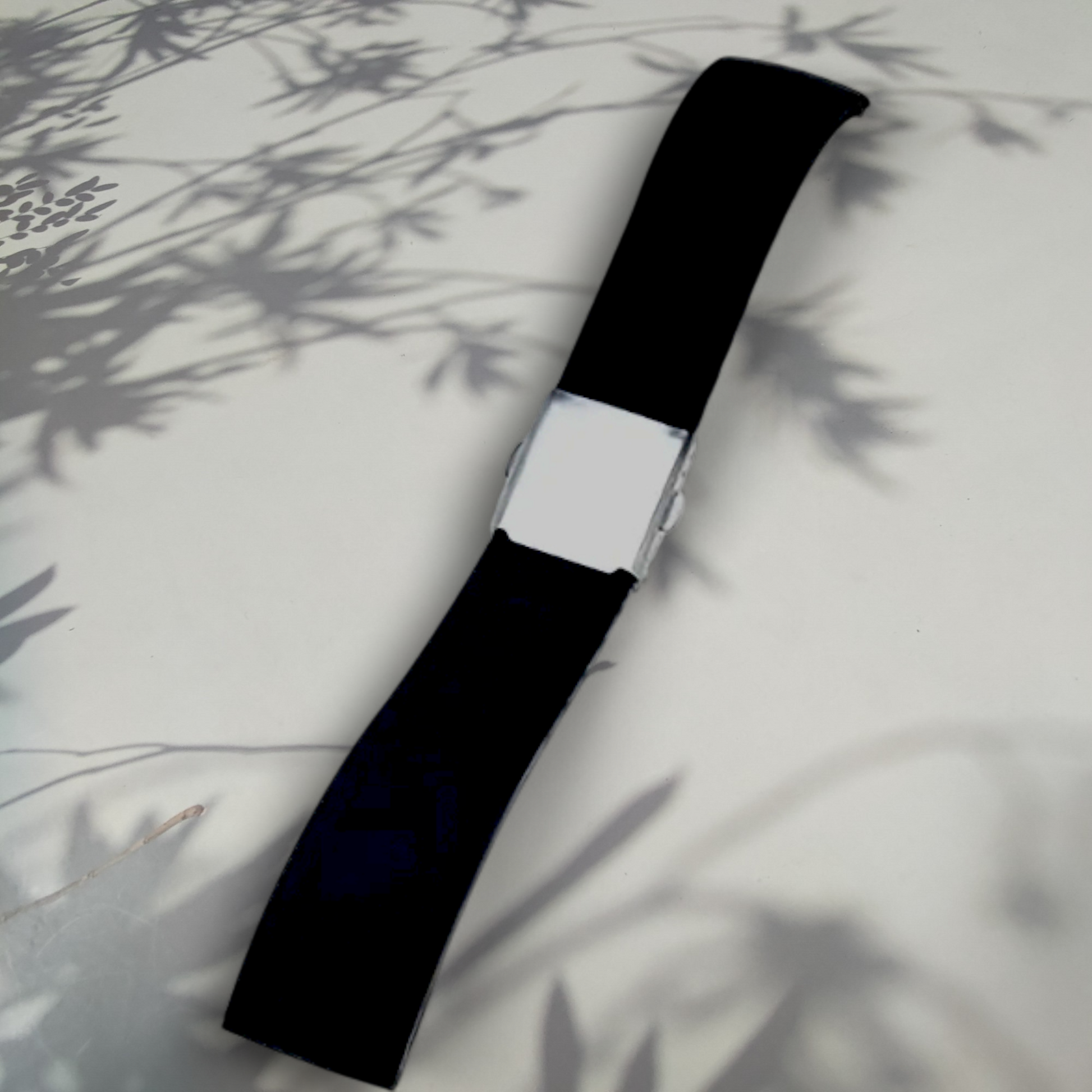 Tämä Kellonranneke silikooni on oikea pikkuruinen taistelija rannettasi varten. Saat värit musta, harmaa, oranssi, sininen ja valkoinen, joten voit yhdistää rannekkeen joko merirosvon pelastuslautaan tai ihan vaan arkiseen kahvipöytään. Materiaali on pehmeää silikoonia, joka kestää kosteutta ja tuntuu lämpimältä ranteessa kuin tuulessa heiluvat viikinkipurjeet. Ranneke on linkki-perhoslukollinen, eli se istuu nätisti ja pysyy siellä missä pitää. Leveys 2cm, paksuus n. 0,4cm ja pituus maksimiasennossa 16cm (+ kellon leveys).