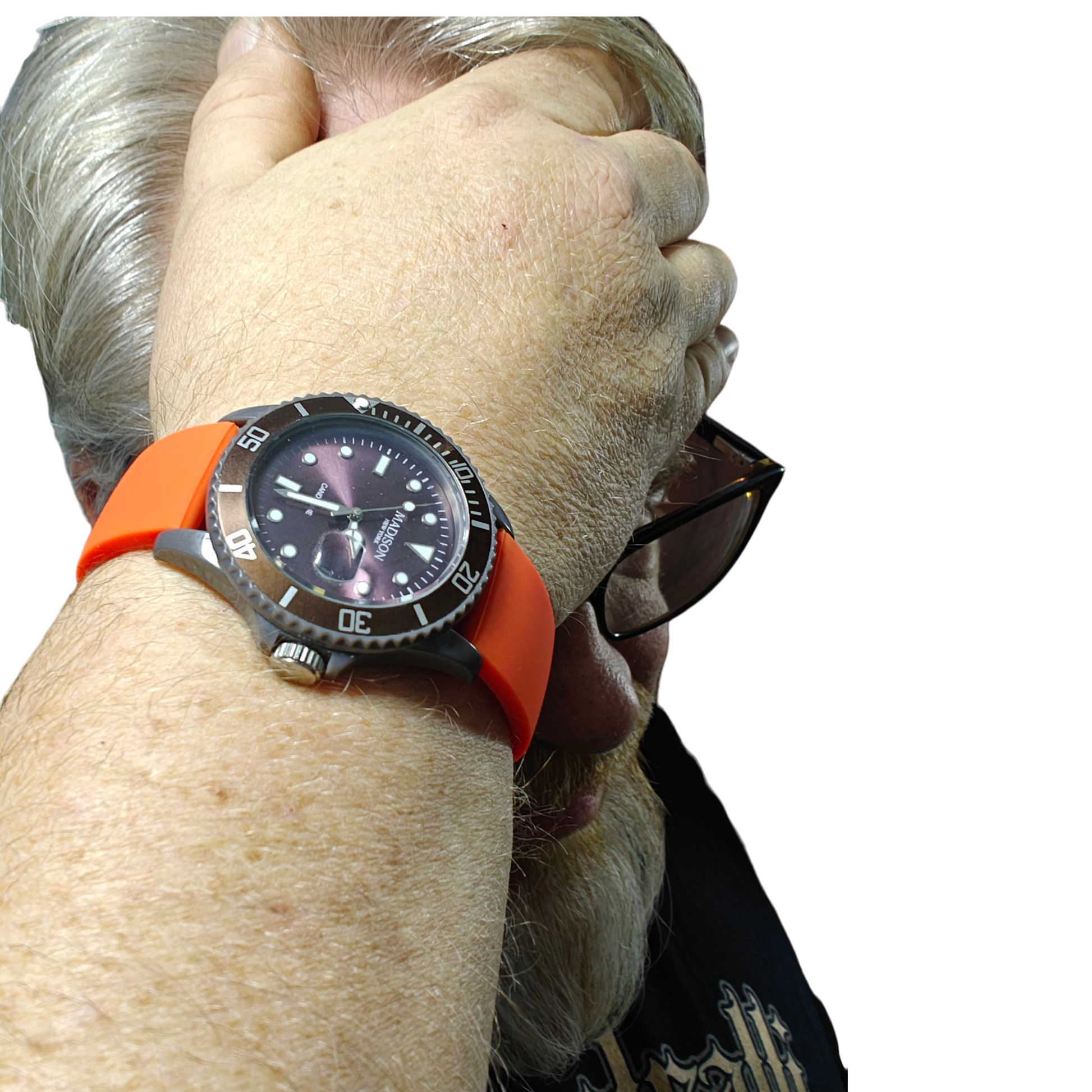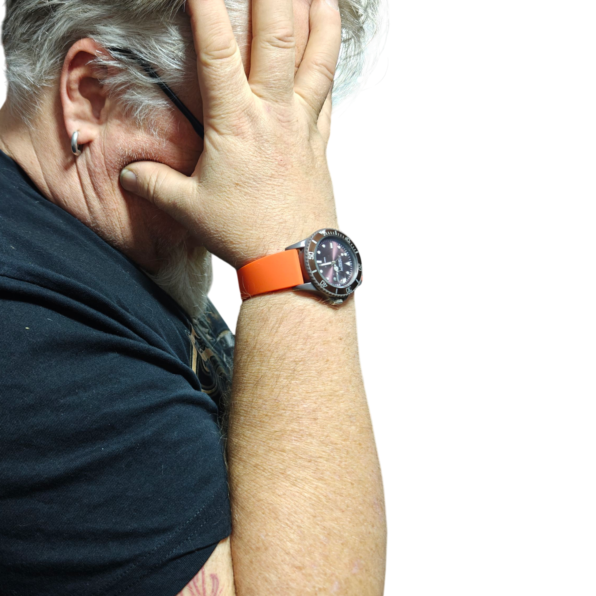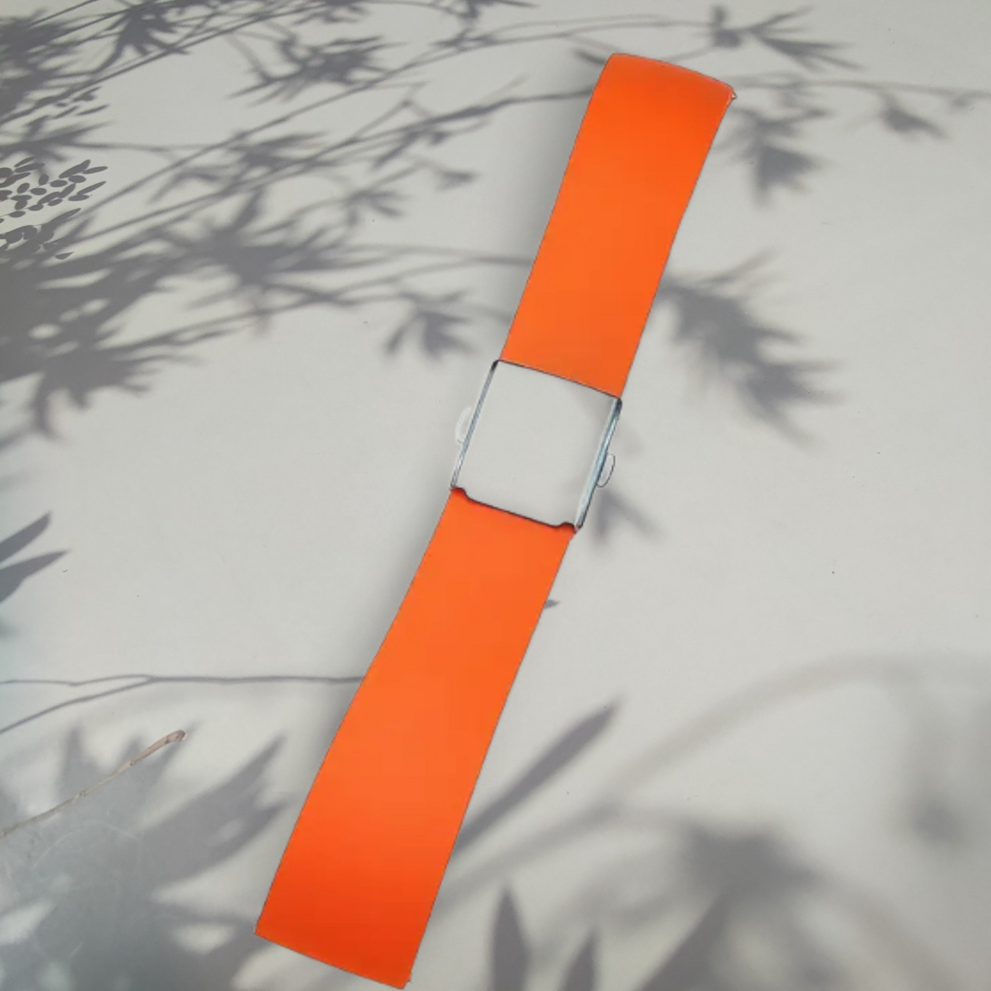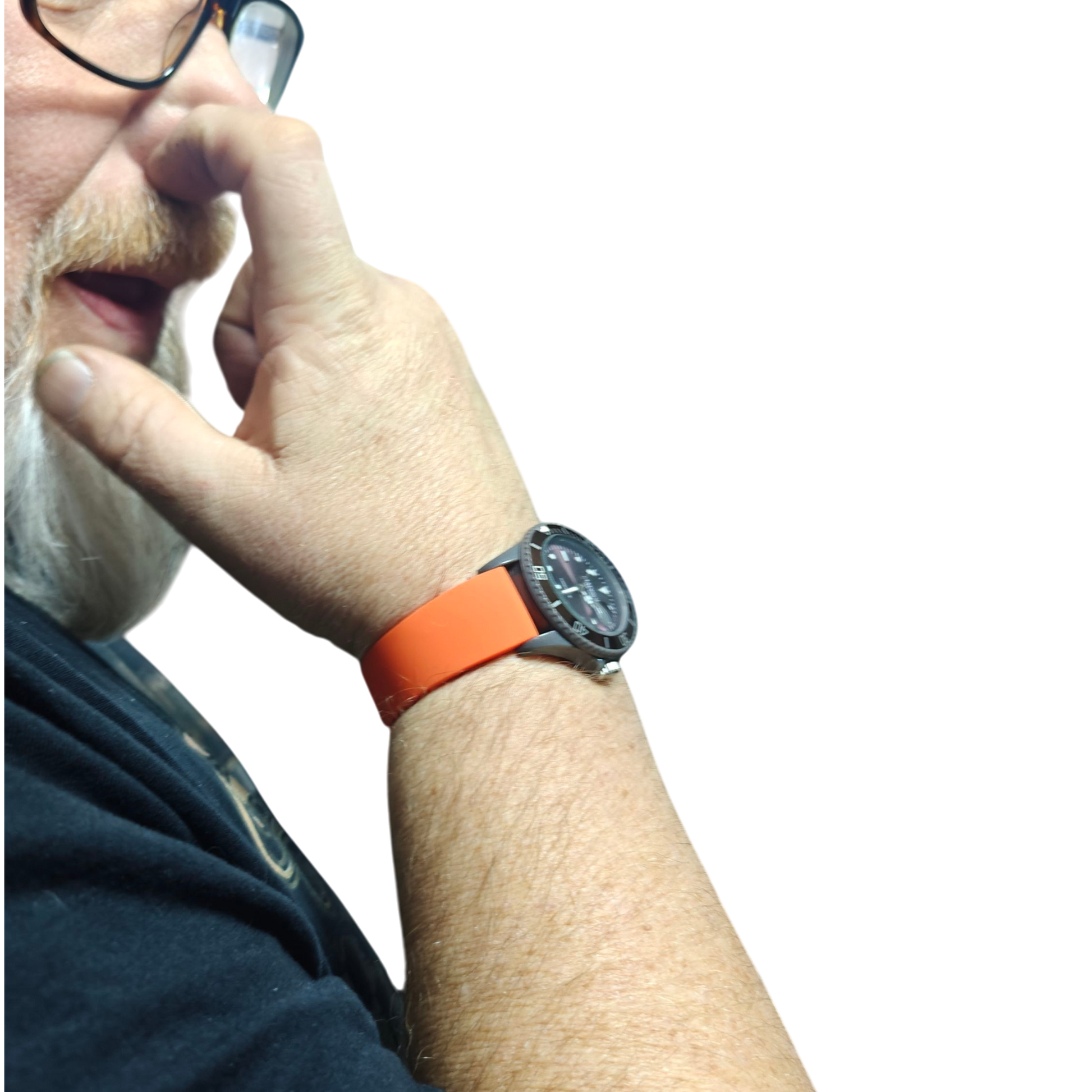 Tämä Kellonranneke silikooni on oikea pikkuruinen taistelija rannettasi varten. Saat värit musta, harmaa, oranssi, sininen ja valkoinen, joten voit yhdistää rannekkeen joko merirosvon pelastuslautaan tai ihan vaan arkiseen kahvipöytään. Materiaali on pehmeää silikoonia, joka kestää kosteutta ja tuntuu lämpimältä ranteessa kuin tuulessa heiluvat viikinkipurjeet. Ranneke on linkki-perhoslukollinen, eli se istuu nätisti ja pysyy siellä missä pitää. Leveys 2cm, paksuus n. 0,4cm ja pituus maksimiasennossa 16cm (+ kellon leveys).