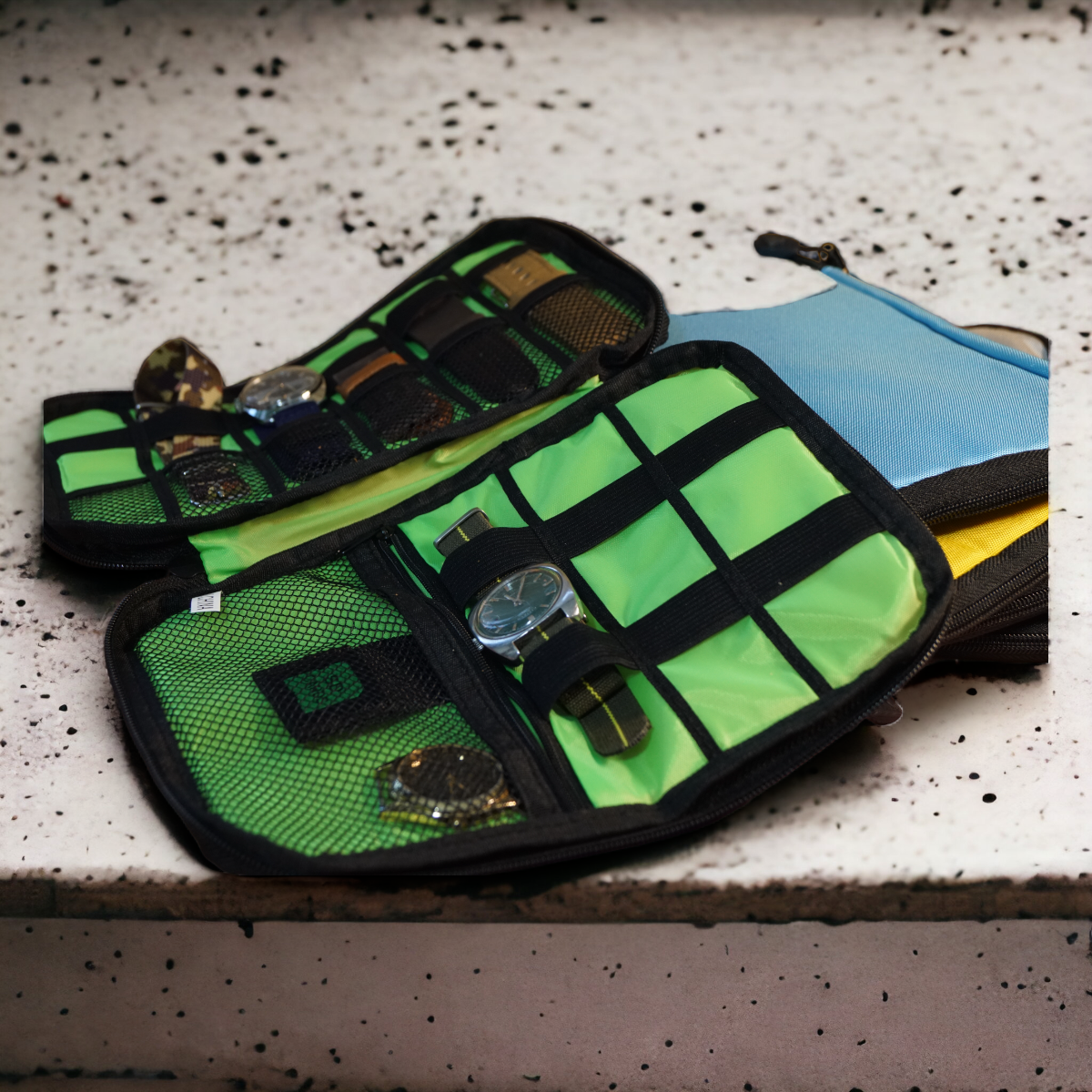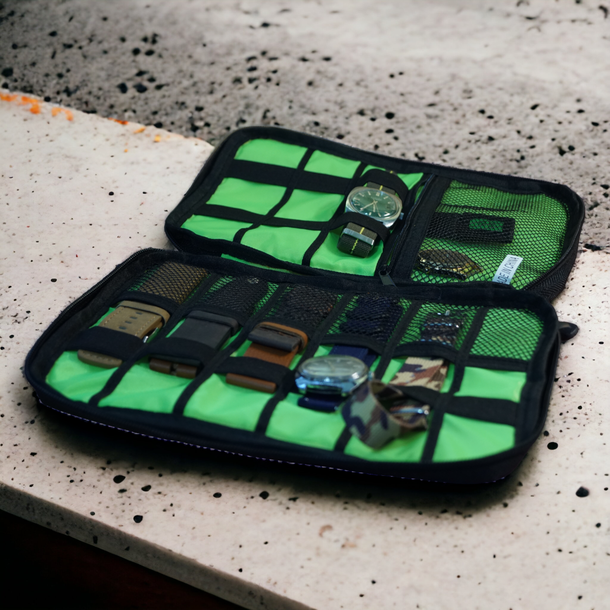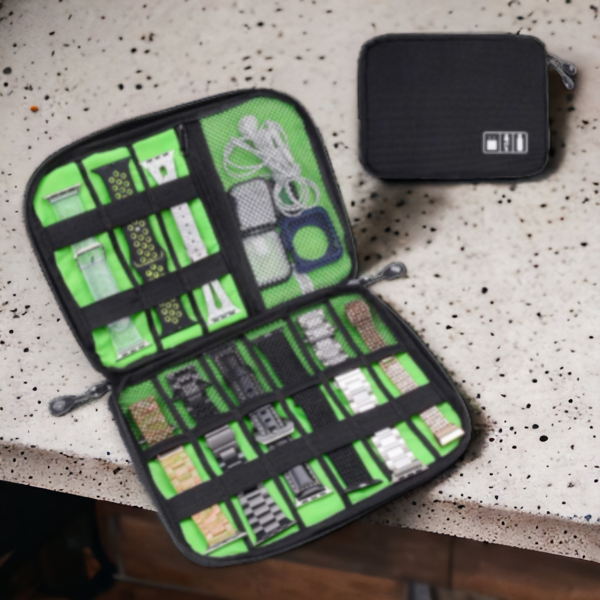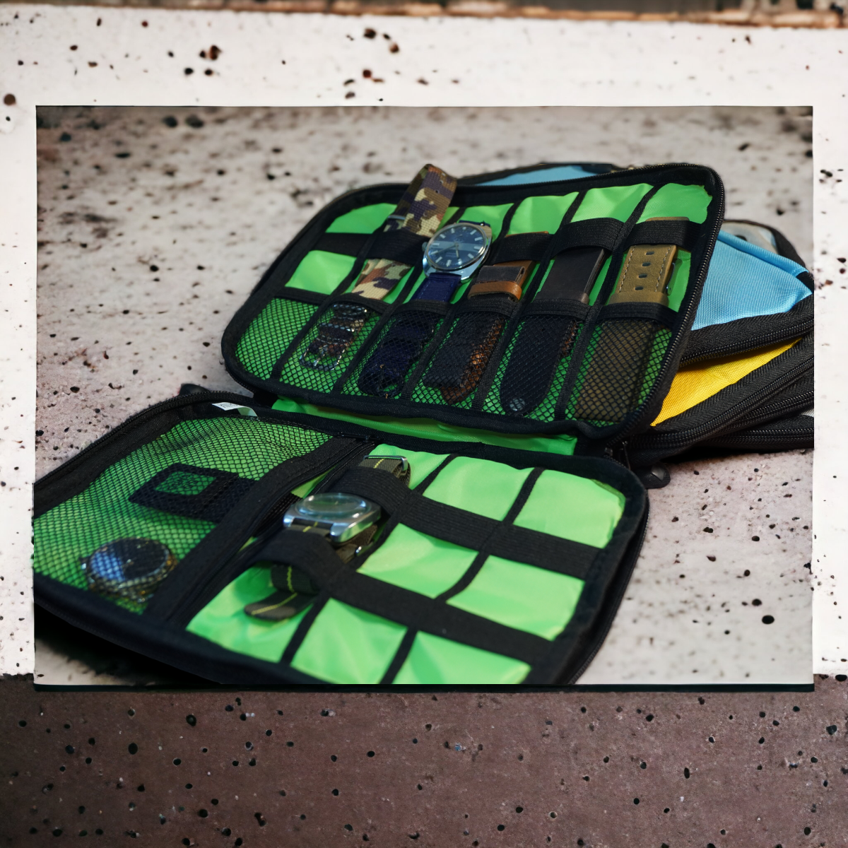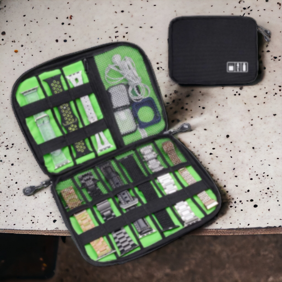 Helposti vetoketjulla avattavissa oleva rakenne auttaa rannekkeiden nopeassa vaihdossa. Tämä tarvike / rannekekotelo kestää ja rannekkeet pysyvät kunnossa.